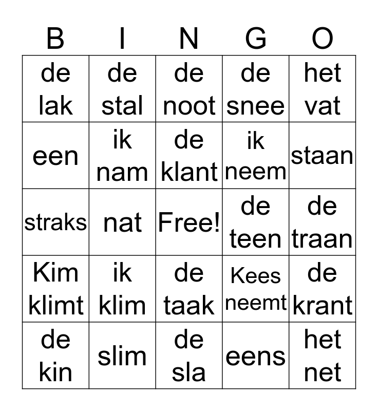 This bingo card has a free space and 48 words: de kans, het net, klaar, de sla, ik klim, naar, de stal, de naam, een, de slak, ik nam, de snee, de krant, Kees neemt, de kan, nee, de klant, de teen, neer, het vat, nat, eens, de lak, ik neem, min, staan, de kin, vast, de taak, Kim klimt, vlas, stil, de soort, Kim, slim, de klok, aan, de traan, de man, naast, de tast, de maan, de noot, Kim nam, straks, de smaak, de taal and de steen.
