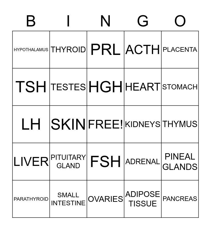 This bingo card has a free space and 24 words: PITUITARY GLAND, SMALL INTESTINE, HGH, PARATHYROID, PLACENTA, HYPOTHALAMUS, TSH, THYROID, KIDNEYS, FSH, HEART, LH, ADRENAL, PINEAL GLANDS, TESTES, ADIPOSE TISSUE, THYMUS, PRL, STOMACH, SKIN, PANCREAS, LIVER, ACTH and OVARIES.