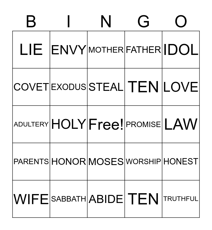 This bingo card has a free space and 24 words: HONOR, SABBATH, STEAL, WIFE, IDOL, LIE, COVET, ENVY, PROMISE, MOSES, TEN, ADULTERY, WORSHIP, HONEST, EXODUS, TEN, LAW, MOTHER, LOVE, HOLY, TRUTHFUL, PARENTS, FATHER and ABIDE.