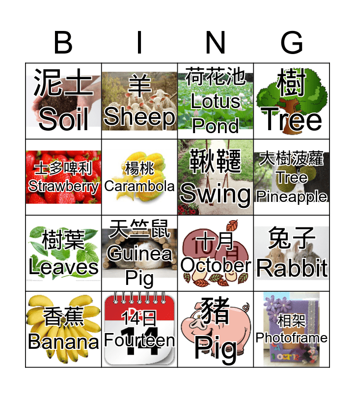 This bingo card has 20 images and 20 words: 兔子 Rabbit, 馬 Horse, 荷花池 Lotus Pond, 吊床 Hammock, 香蕉 Banana, 士多啤利 Strawberry, 14日 Fourteen, 泥土 Soil, 樹葉 Leaves, 羊 Sheep, 天竺鼠 Guinea Pig, 十月 October, 楊桃 Carambola, 相架 Photoframe, 鞦韆 Swing, 芒果 Mango, 大樹菠蘿 Tree Pineapple, 樹 Tree, 豬 Pig and 洛神花 Roselle.