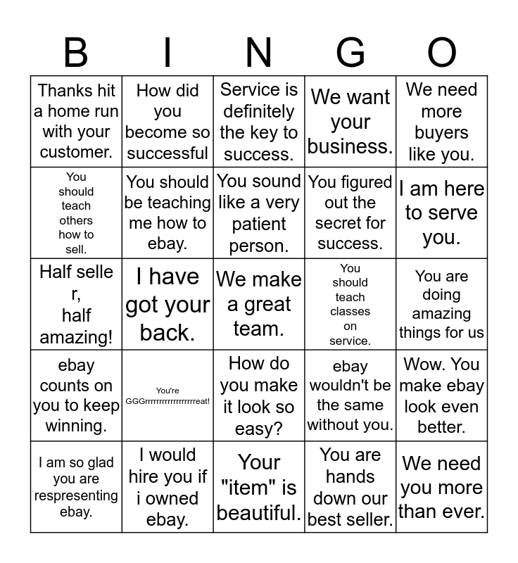 This bingo card has 25 words: You're GGGrrrrrrrrrrrrrrrrrreat!, Your "item" is beautiful., You sound like a very patient person., I am so glad you are respresenting ebay., We need more buyers like you., Thanks hit a home run with your customer., You should teach others how to sell., How did you become so successful, You should teach classes on service., How do you make it look so easy?, You figured out the secret for success., Half seller, half amazing!, ebay wouldn't be the same without you., Wow. You make ebay look even better., You should be teaching me how to ebay., We need you more than ever., You are doing amazing things for us, Service is definitely the key to success., I am here to serve you., I have got your back., We make a great team., I would hire you if i owned ebay., ebay counts on you to keep winning., We want your business. and You are hands down our best seller..