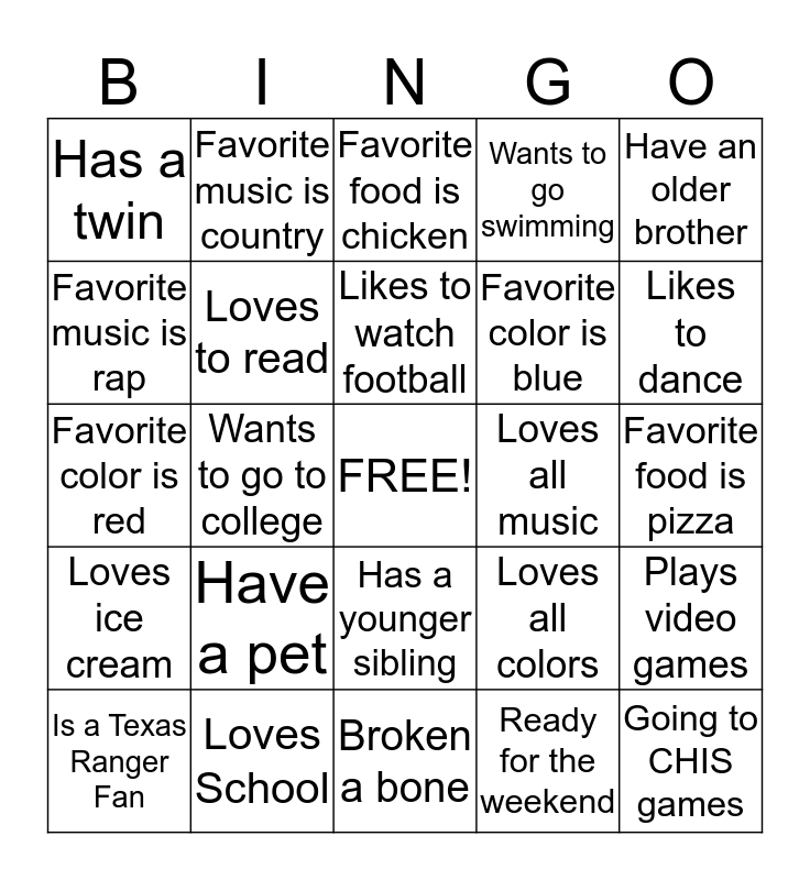 This bingo card has a free space and 25 words: Have a pet, Broken a bone, Likes to watch football, Is a Texas Ranger Fan, Have an older brother, Has a twin, Favorite music is rap, Favorite music is country, Loves all music, Has a younger sibling, Favorite color is blue, Favorite color is red, Loves all colors, Plays video games, Loves to read, Ready for Winter break, Favorite food is pizza, Favorite food is chicken, Likes to dance, Wants to go to college, Going to CHIS games, Loves School, Loves ice cream, Wants to go swimming and Ready for the weekend.