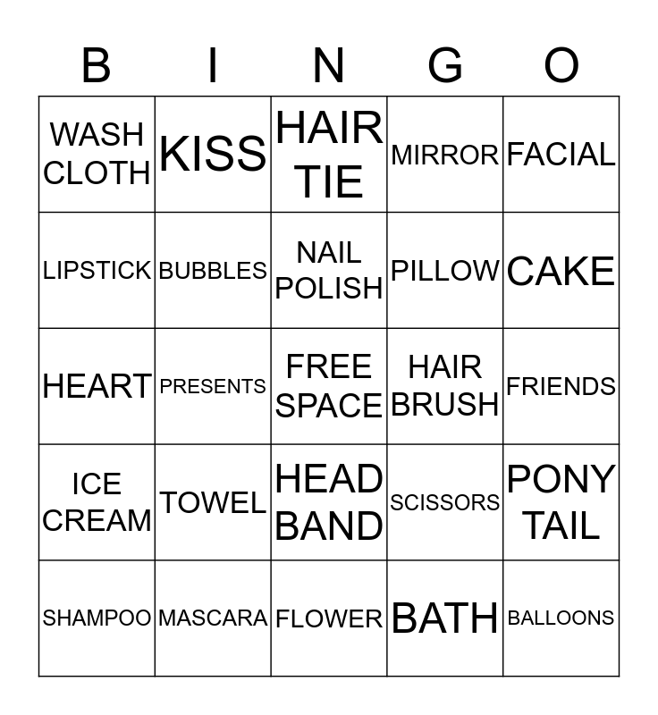 This bingo card has a free space and 24 words: TOWEL, MASCARA, NAIL POLISH, SHAMPOO, FACIAL, WASH CLOTH, LIPSTICK, KISS, HAIR BRUSH, HEAD BAND, PILLOW, HEART, SCISSORS, PONY TAIL, BUBBLES, BATH, FRIENDS, HAIR TIE, CAKE, PRESENTS, BALLOONS, ICE CREAM, MIRROR and FLOWER.