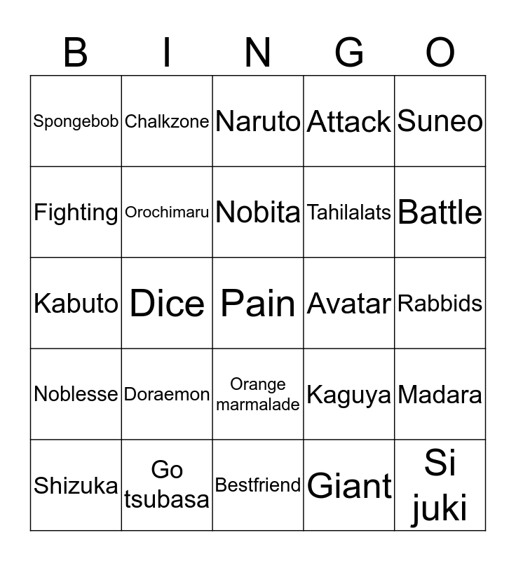 This bingo card has a free space and 24 words: Shizuka, Doraemon, Nobita, Giant, Suneo, Spongebob, Chalkzone, Naruto, Avatar, Rabbids, Kabuto, Orochimaru, Kaguya, Madara, Fighting, Go tsubasa, Bestfriend, Attack, Battle, Noblesse, Dice, Orange marmalade, Tahilalats and Si juki.