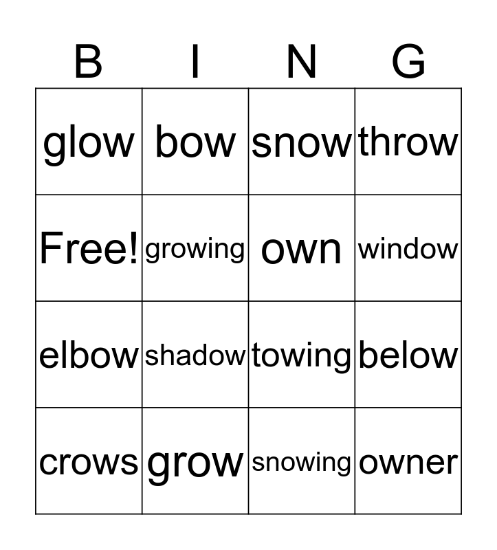 This bingo card has 16 words: grow, below, snow, glow, elbow, bow, towing, snowing, Free!, growing, crows, throw, shadow, window, own and owner.