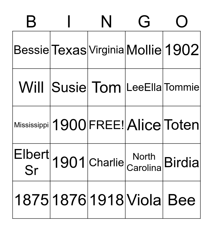 This bingo card has a free space and 24 words: 1901, 1876, Tom, 1875, 1902, Bessie, Will, Texas, Alice, Charlie, LeeElla, Mississippi, North Carolina, Birdia, Susie, Viola, Toten, Virginia, Tommie, 1900, Bee, Elbert Sr, Mollie and 1918.
