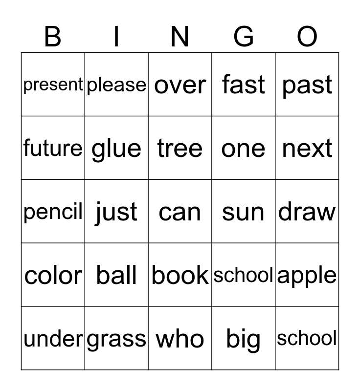 This bingo card has a free space and 24 words: ball, grass, tree, under, past, present, future, please, sun, book, one, pencil, school, apple, glue, big, draw, over, next, just, school, color, fast and who.
