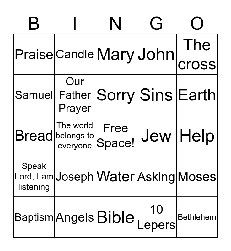 This bingo card has a free space and 24 words: Joseph, Angels, Sorry, Baptism, The cross, Praise, Samuel, Candle, Jew, Water, Sins, Bread, Asking, Moses, Our Father Prayer, 10 Lepers, Help, Mary, Earth, The world belongs to everyone, Bethlehem, Speak Lord, I am listening, John and Bible.