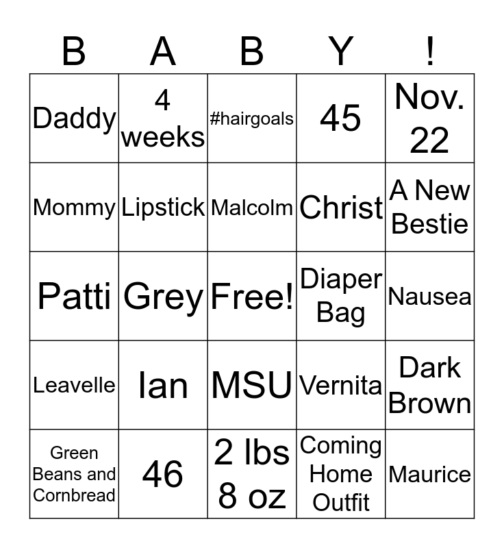 This bingo card has a free space and 24 words: Ian, 46, Malcolm, Green Beans and Cornbread, Nov. 22, Daddy, Mommy, 4 weeks, Diaper Bag, MSU, Christ, Patti, Vernita, Dark Brown, Lipstick, Coming Home Outfit, Nausea, #hairgoals, A New Bestie, Grey, Maurice, Leavelle, 45 and 2 lbs 8 oz.