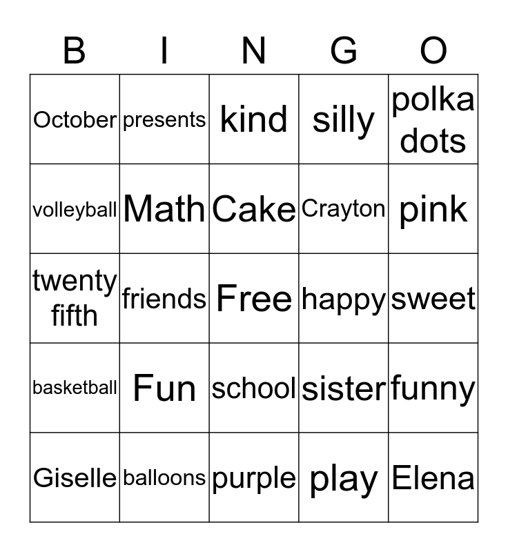 This bingo card has a free space and 24 words: Giselle, Fun, Cake, play, polka dots, October, presents, kind, happy, sweet, twenty fifth, Math, sister, funny, volleyball, balloons, purple, silly, pink, basketball, friends, school, Crayton and Elena.