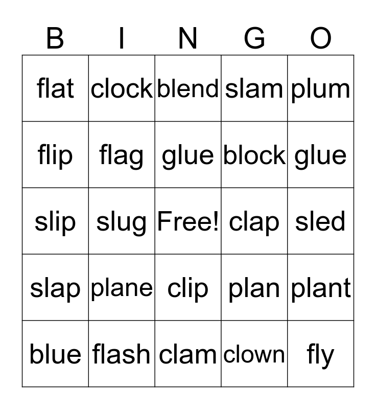 This bingo card has a free space and 24 words: plane, flash, glue, blue, plum, flat, flip, clock, clap, clip, block, slip, plan, plant, flag, clown, sled, blend, glue, slug, fly, slap, slam and clam.