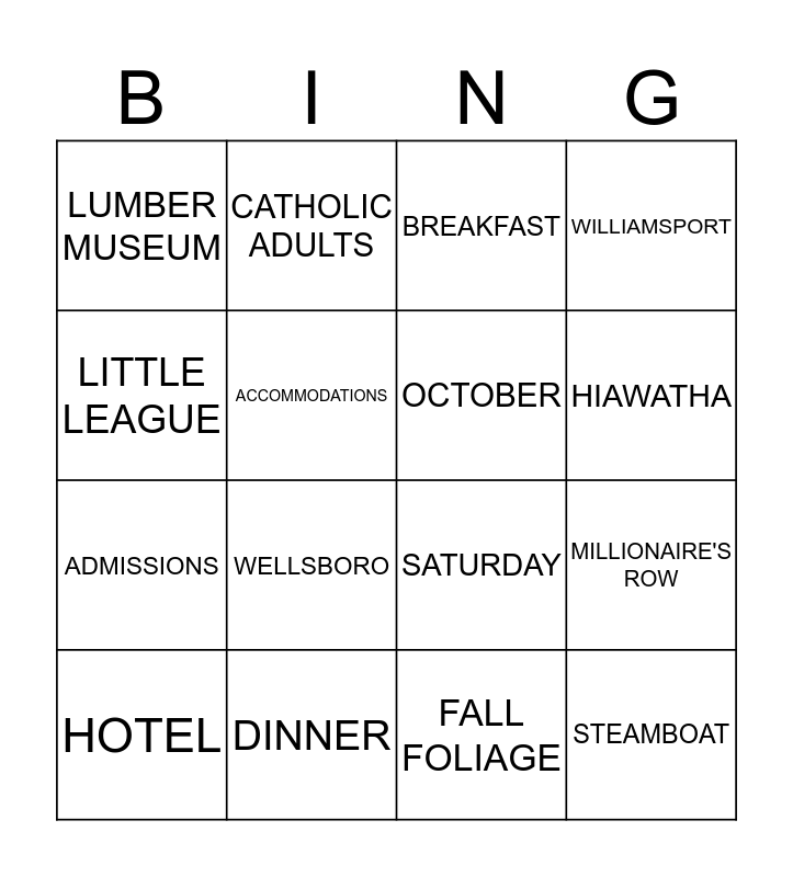 This bingo card has 36 words: Free!, GRAND CANYON, PENNSYLVANIA, OCTOBER, WAGON RIDE, STEAMBOAT, HIAWATHA, TABOR MUSEUM, LITTLE LEAGUE, TROLLEY RIDE, MILLIONAIRE'S ROW, WILLIAMSPORT, TIOGA EXPRESS, DINNER, WELLSBORO, LUMBER MUSEUM, BUS TRIP, OVERNIGHT, HOTEL, BREAKFAST, FALL FOLIAGE, GROUP SHOT, BUS DRIVER, 50-50, BINGO GAME, CATHOLIC ADULTS, SATURDAY, SUNDAY, ADMISSIONS, ACCOMMODATIONS, FLYERS, SECOND PRIZES, BUS PRAYER, UPCOMING EVENTS, HALLOWEEN DANCE and HEALTH NIGHT SOCIAL.