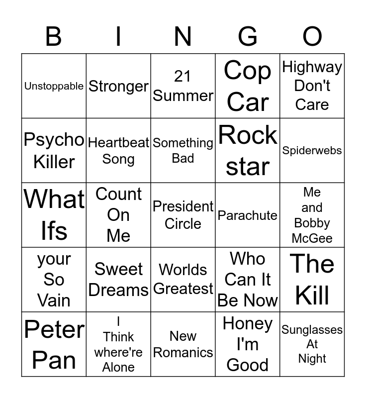 This bingo card has a free space and 24 words: Sweet Dreams, I Think where're Alone, Something Bad, Peter Pan, Highway Don't Care, Unstoppable, Psycho Killer, Stronger, Parachute, Worlds Greatest, Rock star, What Ifs, Who Can It Be Now, The Kill, Heartbeat Song, Honey I'm Good, Me and Bobby McGee, 21 Summer, Spiderwebs, Count On Me, Sunglasses At Night, your So Vain, Cop Car and New Romanics.