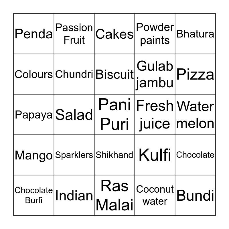 This bingo card has a free space and 24 words: Sparklers, Indian, Biscuit, Chocolate Burfi, Bhatura, Penda, Colours, Passion Fruit, Fresh juice, Shikhand, Gulab jambu, Papaya, Kulfi, Chocolate, Chundri, Coconut water, Water melon, Cakes, Pizza, Salad, Bundi, Mango, Powder paints and Ras Malai.