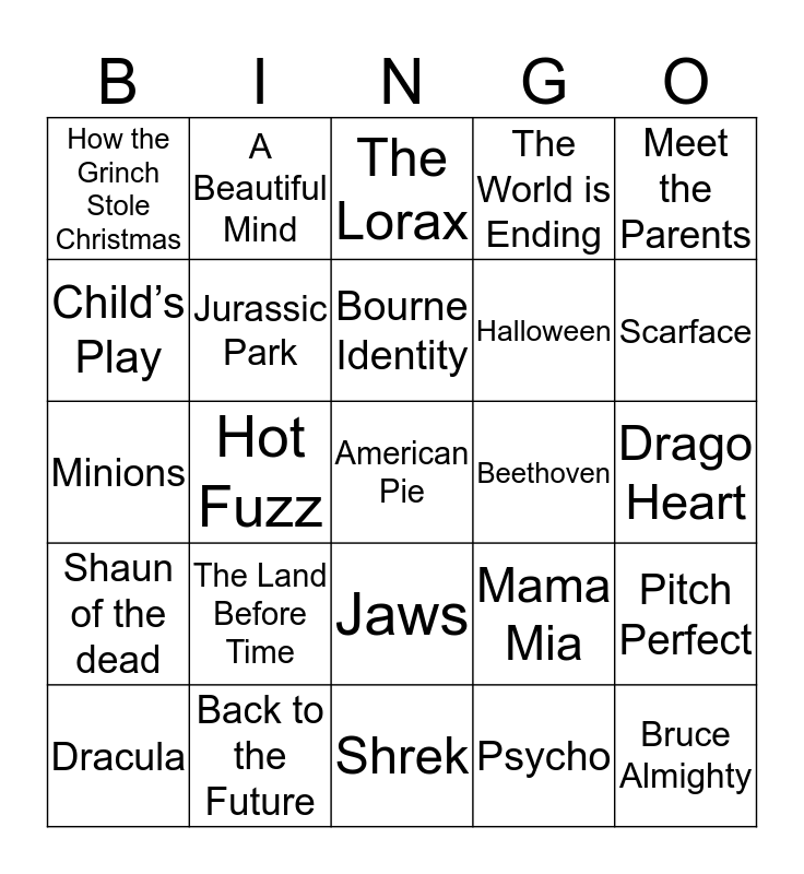 This bingo card has 40 words: Fast and Furious, Minions, Despicable Me, Jurassic Park, Back to the Future, Jaws, Bourne Identity, Fifty Shades of Grey, Meet the Parents, Shaun of the dead, Hot Fuzz, The World is Ending, American Pie, Drago Heart, Beethoven, The Land Before Time, An American Tail, How the Grinch Stole Christmas, The Cat in the Hat, The Lorax, Pitch Perfect, Psycho, Halloween, Child’s Play, Chucky, Insidious, The Mummy, The Scorpion King, Bruce Almighty, Ted, The Purge, Dracula, Sing, Mama Mia, Scarface, Shrek, American Graffiti, Apollo 13, A Beautiful Mind and Van Helsing.