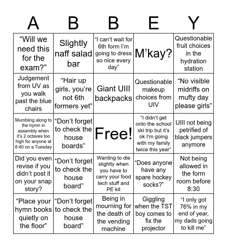 This bingo card has a free space and 24 words: “Don’t forget to check the house board”, “Don’t forget to check the house board”, Giant UIII backpacks, “Place your hymn books quietly on the floor”, Questionable fruit choices in the hydration station, “Will we need this for the exam?”, Judgement from UV as you walk past the blue chairs, Slightly naff salad bar, “I didn’t get onto the school ski trip but it’s ok I’m going with my family twice this year”, Wanting to die slightly when you have to carry your food tech stuff and PE kit, Questionable makeup choices from UIV, Mumbling along to the hymn in assembly when it’s 2 octaves too high for anyone at 8:40 on a Tuesday, “Does anyone have any spare hockey socks?”, Not being allowed in the form room before 8:30, “Hair up girls, you’re not 6th formers yet”, Giggling when the TST boy comes to fix the projector, UIII not being petrified of black jumpers anymore, “I can’t wait for 6th form I’m going to dress so nice every day”, “No visible midriffs on mufty day please girls”, “Don’t forget to check the house boards”, “I only got 76% in my end of year, my dads going to kill me”, Did you even revise if you didn’t post it on your snap story?, M’kay? and Being in mourning for the death of the vending machine.
