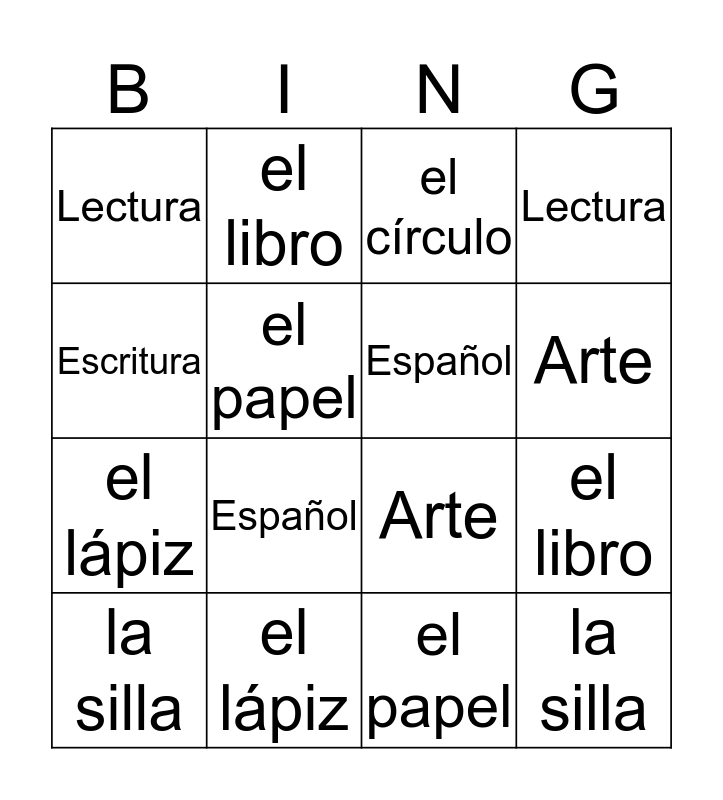 ⚠ This card has duplicate items: Español (3), Arte (3), el lápiz (3), Lectura (3), el papel (2), el círculo (2), el libro (2), la silla (2), Matemáticas (2), el marcador (2), Escritura (2)