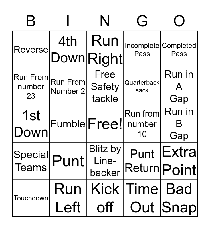 This bingo card has a free space and 24 words: Punt, Run Left, Free Safety tackle, Touchdown, Completed Pass, Reverse, Run From number 23, 4th Down, Run from number 10, Blitz by Line-backer, Quarterback sack, 1st Down, Punt Return, Extra Point, Run From Number 2, Time Out, Run in B Gap, Run Right, Run in A Gap, Fumble, Bad Snap, Special Teams, Incomplete Pass and Kick off.