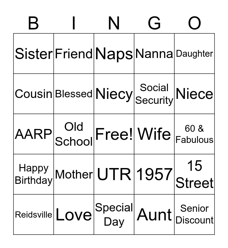 This bingo card has a free space and 24 words: Mother, Love, Niecy, Reidsville, Daughter, Sister, Cousin, Friend, Wife, UTR, Social Security, AARP, 1957, 15 Street, Blessed, Aunt, 60 & Fabulous, Naps, Niece, Old School, Senior Discount, Happy Birthday, Nanna and Special Day.
