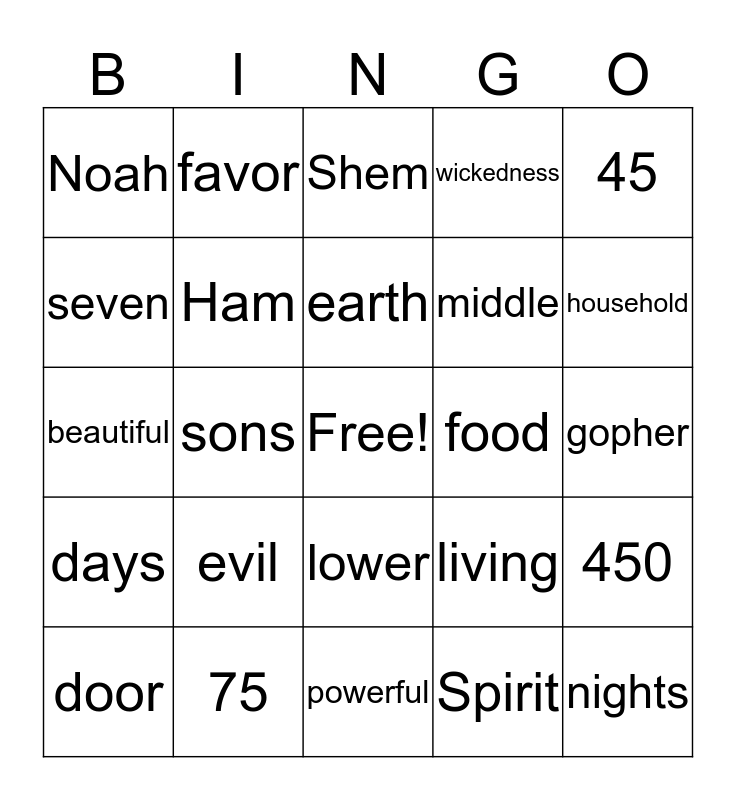 This bingo card has a free space and 33 words: birds, righteous, sons, Nephilim, days, Ham, 45, door, favor, wipe, earth, Shem, eighteen, pitch, food, household, 75, beautiful, evil, living, lower, famous, Noah, gopher, powerful, nights, wickedness, middle, seven, 450, covenant, Spirit and two.