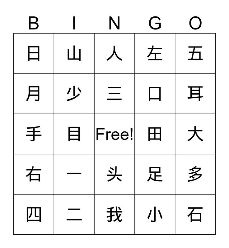 This bingo card has a free space and 24 words: 一, 二, 三, 四, 五, 日, 月, 山, 田, 头, 口, 手, 足, 多, 少, 小, 大, 人, 耳, 目, 石, 右, 左 and 我.