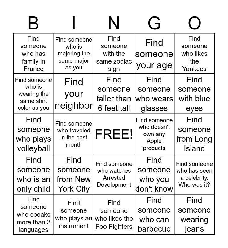 This bingo card has a free space and 24 words: Find someone from New York City, Find someone who plays an instrument, Find someone taller than 6 feet tall, Find someone who speaks more than 3 languages, Find someone who likes the Yankees, Find someone who has family in France, Find someone who is wearing the same shirt color as you, Find someone who is majoring the same major as you, Find someone who doesn't own any Apple products, Find someone who watches Arrested Development, Find someone who wears glasses, Find someone who plays volleyball, Find someone who you don't know, Find someone who has seen a celebrity. Who was it?, Find your neighbor, Find someone who can barbecue, Find someone from Long Island, Find someone with the same zodiac sign, Find someone with blue eyes, Find someone who traveled in the past month, Find someone wearing jeans, Find someone who is an only child, Find someone your age and Find someone who likes the Foo Fighters.