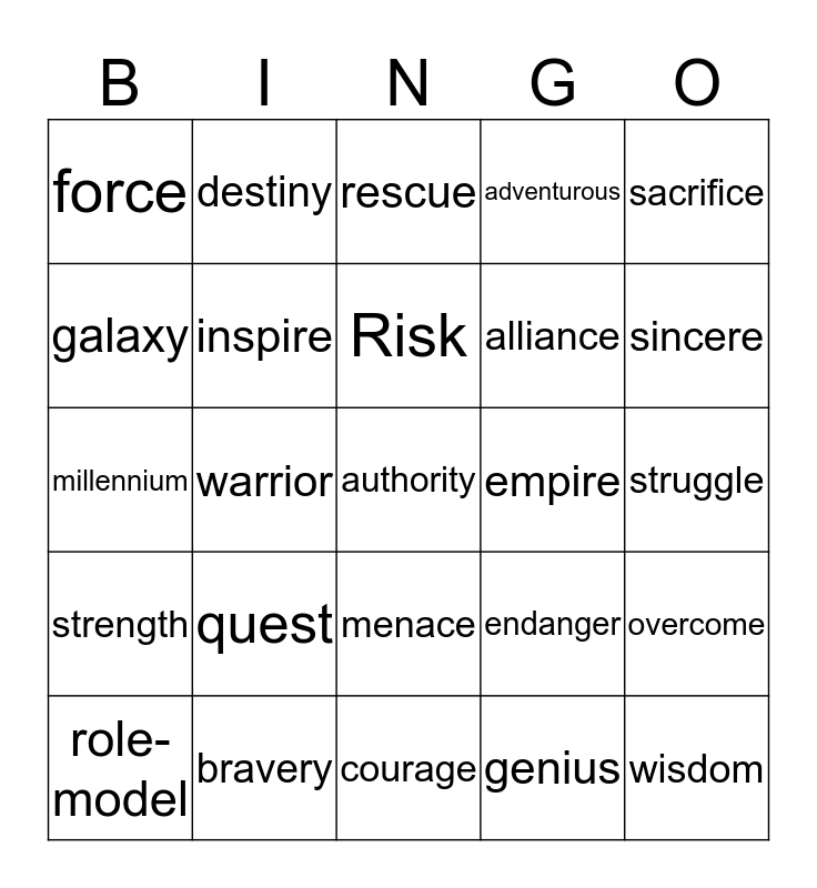 This bingo card has 25 words: quest, courage, Risk, role-model, sacrifice, force, galaxy, destiny, empire, menace, alliance, millennium, endanger, overcome, inspire, wisdom, struggle, rescue, sincere, warrior, authority, bravery, strength, adventurous and genius.
