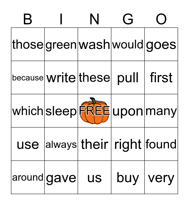 This bingo card has a free space and 24 words: always, gave, these, around, goes, those, because, green, upon, their, pull, which, right, found, write, buy, many, wash, first, sleep, very, use, would and us.