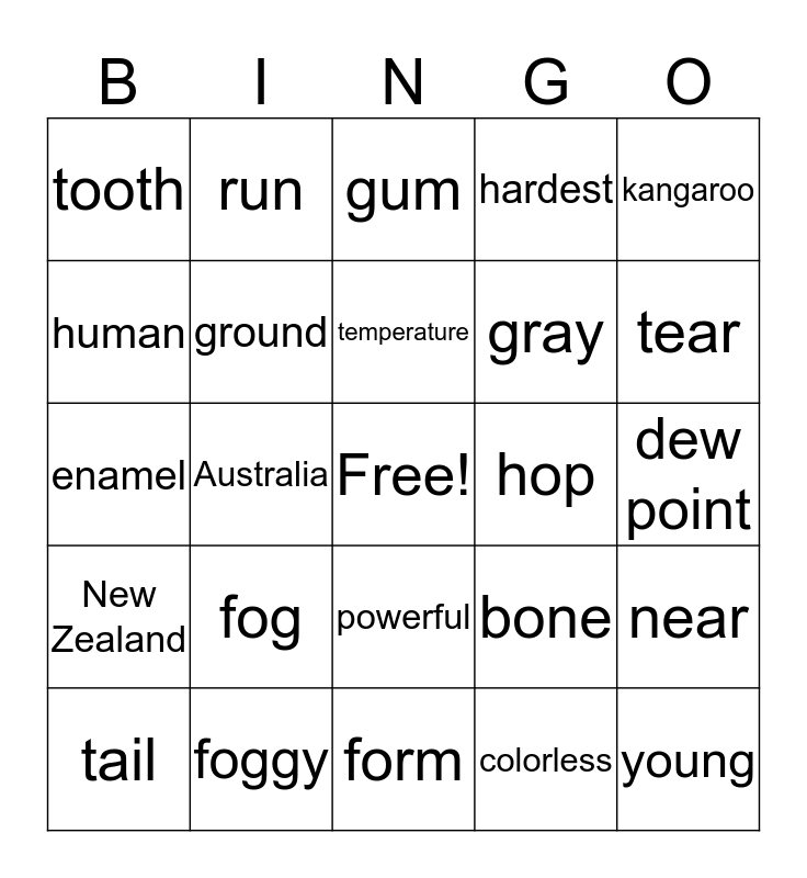 This bingo card has a free space and 24 words: fog, foggy, temperature, tail, kangaroo, tooth, human, run, hop, powerful, gray, enamel, bone, near, ground, colorless, dew point, gum, tear, Australia, young, New Zealand, hardest and form.