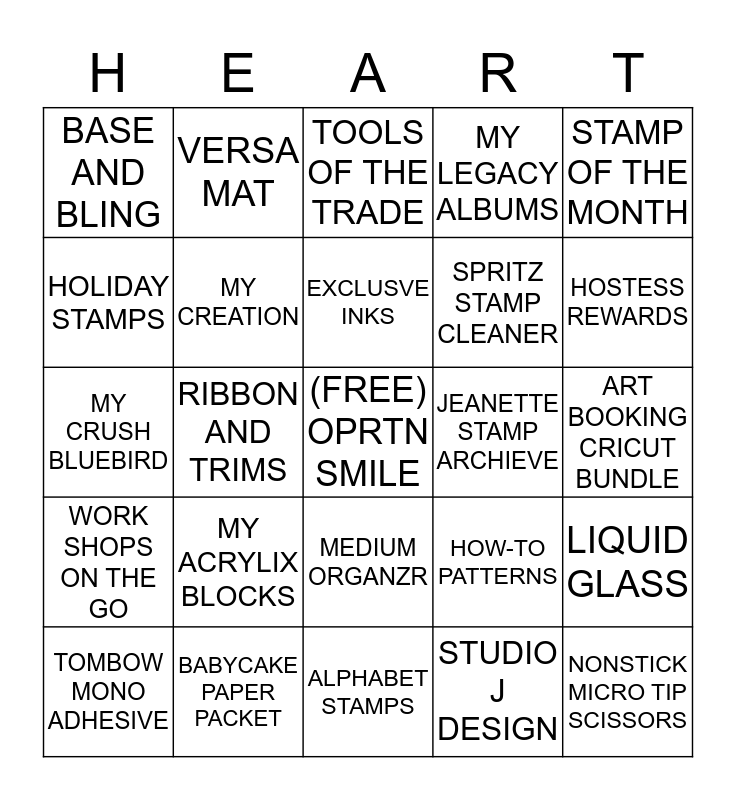 This bingo card has a free space and 24 words: MY ACRYLIX BLOCKS, BABYCAKE PAPER PACKET, EXCLUSVE INKS, TOMBOW MONO ADHESIVE, STAMP OF THE MONTH, BASE AND BLING, HOLIDAY STAMPS, VERSA MAT, JEANETTE STAMP ARCHIEVE, MEDIUM ORGANZR, SPRITZ STAMP CLEANER, MY CRUSH BLUEBIRD, HOW-TO PATTERNS, LIQUID GLASS, MY CREATION, STUDIO J DESIGN, ART BOOKING CRICUT BUNDLE, TOOLS OF THE TRADE, HOSTESS REWARDS, RIBBON AND TRIMS, NONSTICK MICRO TIP SCISSORS, WORK SHOPS ON THE GO, MY LEGACY ALBUMS and ALPHABET STAMPS.