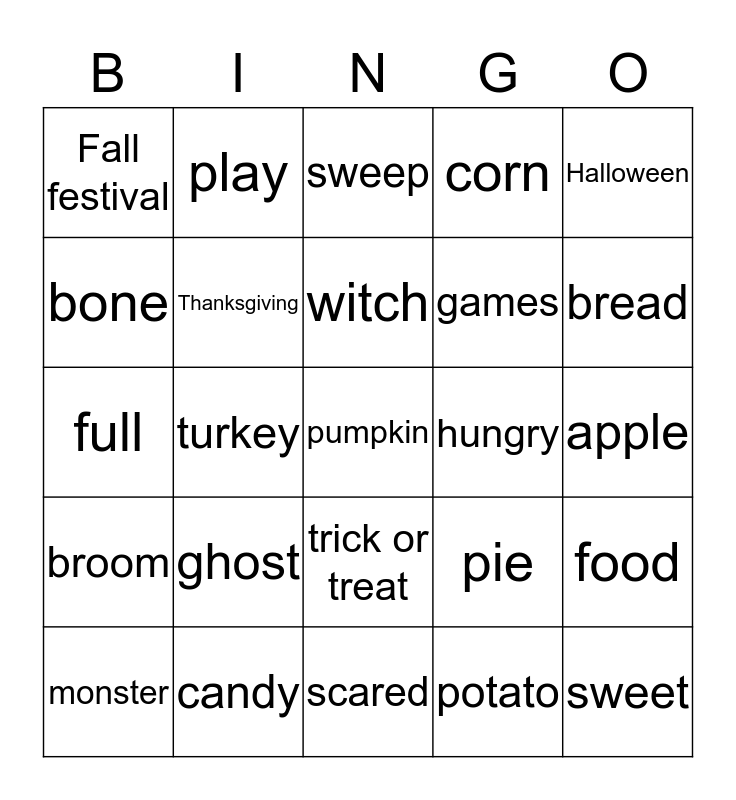 This bingo card has 25 words: ghost, scared, witch, monster, Halloween, Fall festival, bone, play, hungry, trick or treat, games, full, pie, food, Thanksgiving, sweet, apple, sweep, bread, turkey, pumpkin, candy, broom, corn and potato.