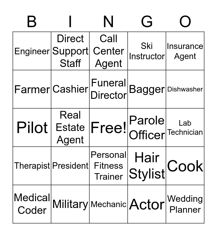 This bingo card has a free space and 24 words: President, Military, Funeral Director, Medical Coder, Insurance Agent, Engineer, Farmer, Direct Support Staff, Parole Officer, Personal Fitness Trainer, Bagger, Pilot, Hair Stylist, Cook, Cashier, Actor, Lab Technician, Call Center Agent, Dishwasher, Real Estate Agent, Wedding Planner, Therapist, Ski Instructor and Mechanic.