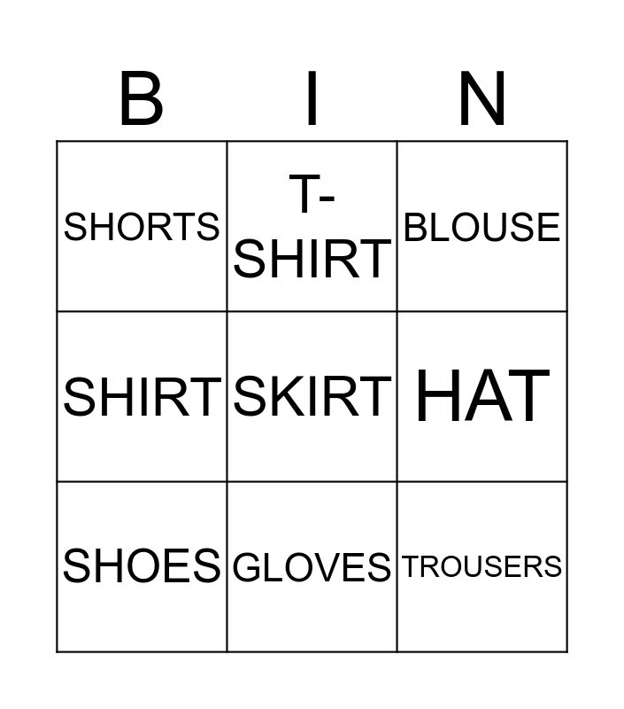 This bingo card has a free space and 11 words: BOOTS, GLOVES, TROUSERS, SHOES, T-SHIRT, BLOUSE, HAT, SOCKS, SHIRT, SHORTS and JACKET.