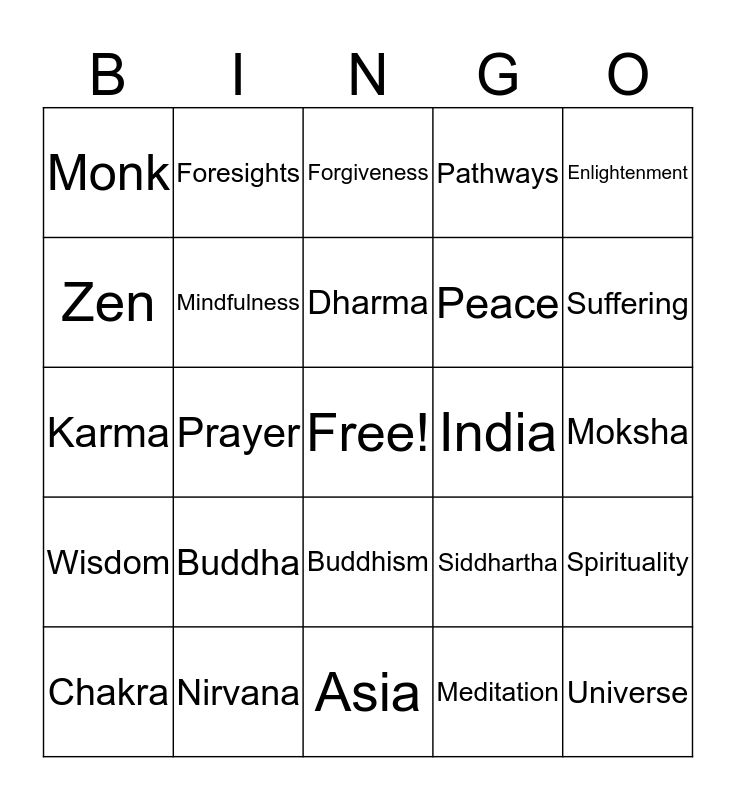 This bingo card has a free space and 24 words: Buddha, Nirvana, Dharma, Chakra, Enlightenment, Monk, Zen, Foresights, India, Buddhism, Peace, Karma, Siddhartha, Spirituality, Mindfulness, Meditation, Moksha, Forgiveness, Suffering, Prayer, Universe, Wisdom, Pathways and Asia.