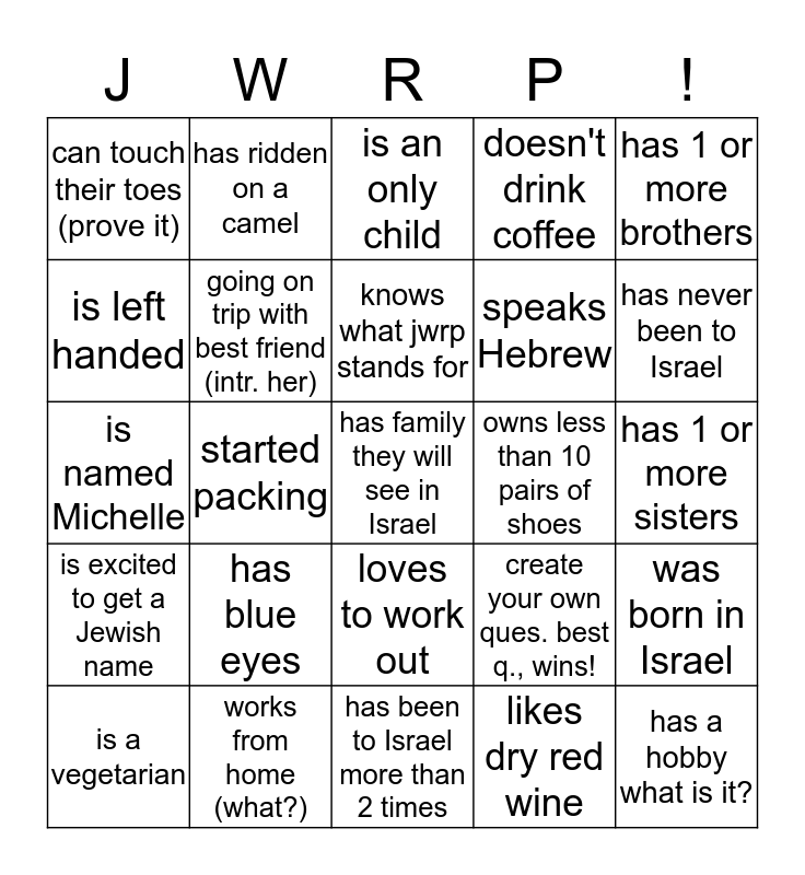 This bingo card has 25 words: has blue eyes, has been to Israel more than 2 times, knows what jwrp stands for, is a vegetarian, has 1 or more brothers, can touch their toes (prove it), is left handed, has ridden on a camel, owns less than 10 pairs of shoes, loves to work out, speaks Hebrew, is named Michelle, create your own ques. best q., wins!, was born in Israel, going on trip with best friend (intr. her), has a hobby what is it?, has 1 or more sisters, is an only child, has never been to Israel, started packing, has family they will see in Israel, works from home (what?), is excited to get a Jewish name, doesn't drink coffee and likes dry red wine.