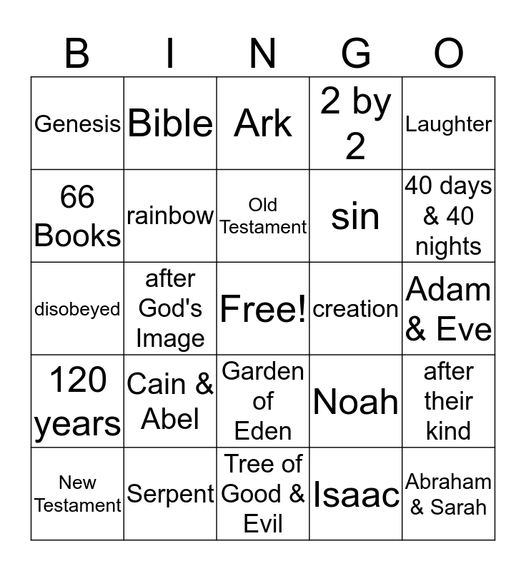 This bingo card has a free space and 24 words: Cain & Abel, Serpent, Old Testament, New Testament, Laughter, Genesis, 66 Books, Bible, creation, Garden of Eden, sin, disobeyed, Noah, after their kind, rainbow, Isaac, Adam & Eve, Ark, 40 days & 40 nights, after God's Image, Abraham & Sarah, 120 years, 2 by 2 and Tree of Good & Evil.