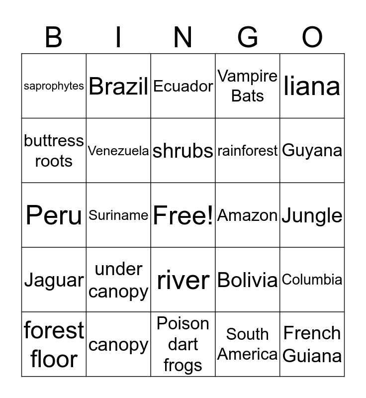 This bingo card has a free space and 24 words: under canopy, canopy, shrubs, forest floor, liana, saprophytes, buttress roots, Brazil, Amazon, river, rainforest, Peru, Bolivia, Columbia, Venezuela, South America, Jungle, Ecuador, Guyana, Suriname, French Guiana, Jaguar, Vampire Bats and Poison dart frogs.