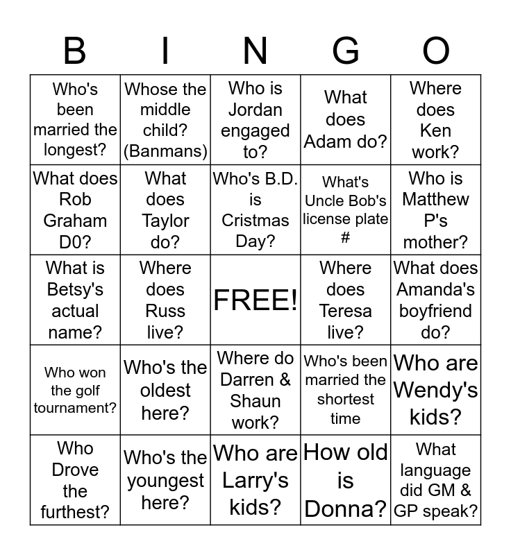 This bingo card has a free space and 24 words: Who's the oldest here?, Who's the youngest here?, Who's B.D. is Cristmas Day?, Who Drove the furthest?, Where does Ken work?, Who's been married the longest?, What does Rob Graham D0?, Whose the middle child? (Banmans), Where does Teresa live?, Where do Darren & Shaun work?, What's Uncle Bob's license plate #, What is Betsy's actual name?, Who's been married the shortest time, Who are Wendy's kids?, What does Taylor do?, How old is Donna?, What does Amanda's boyfriend do?, Who is Jordan engaged to?, Who is Matthew P's mother?, Where does Russ live?, What language did GM & GP speak?, Who won the golf tournament?, What does Adam do? and Who are Larry's kids?.