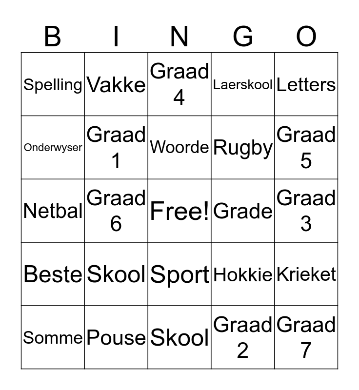This bingo card has a free space and 24 words: Skool, Pouse, Woorde, Somme, Letters, Spelling, Onderwyser, Vakke, Grade, Sport, Rugby, Netbal, Hokkie, Krieket, Graad 1, Graad 2, Graad 3, Graad 4, Graad 5, Graad 6, Graad 7, Beste, Laerskool and Skool.