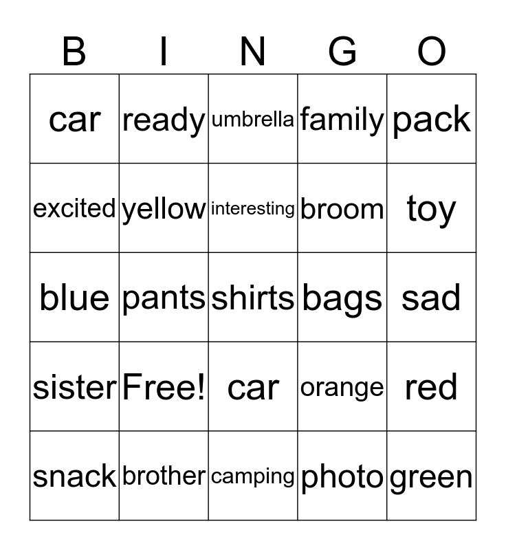 This bingo card has 25 words: Free!, camping, interesting, snack, pack, car, excited, ready, bags, car, broom, blue, orange, red, yellow, green, sad, umbrella, toy, pants, shirts, brother, sister, family and photo.