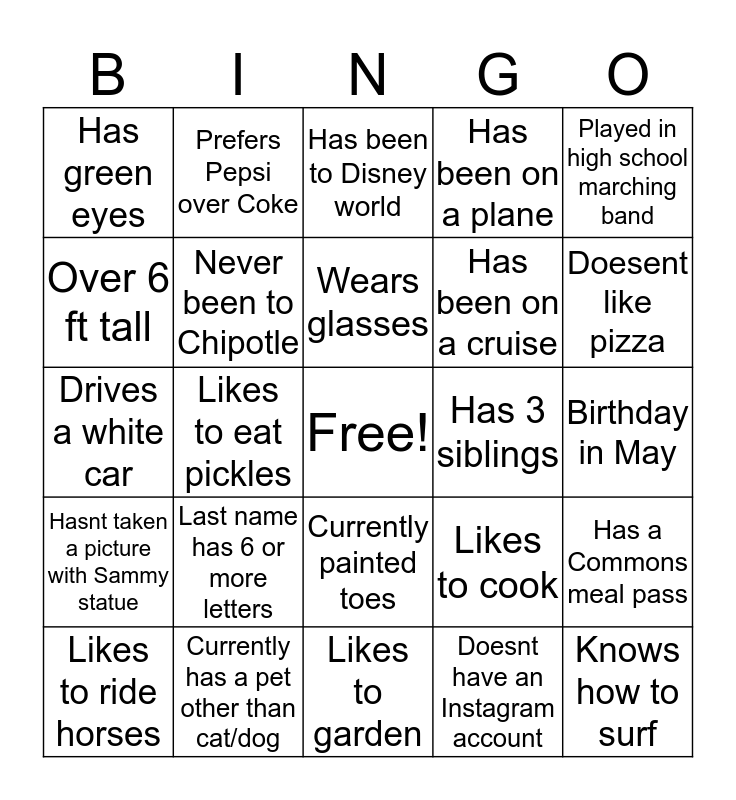 This bingo card has a free space and 24 words: Last name has 6 or more letters, Currently has a pet other than cat/dog, Wears glasses, Likes to ride horses, Played in high school marching band, Has green eyes, Over 6 ft tall, Prefers Pepsi over Coke, Has 3 siblings, Currently painted toes, Has been on a cruise, Drives a white car, Likes to cook, Has a Commons meal pass, Never been to Chipotle, Doesnt have an Instagram account, Birthday in May, Has been to Disney world, Doesent like pizza, Likes to eat pickles, Knows how to surf, Hasnt taken a picture with Sammy statue, Has been on a plane and Likes to garden.