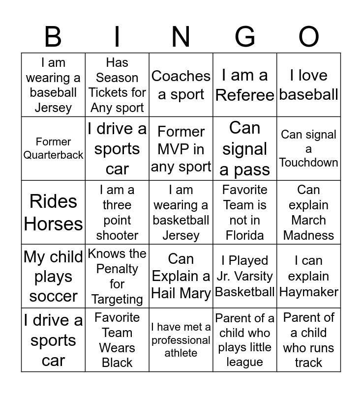 This bingo card has a free space and 24 words: Knows the Penalty for Targeting, Favorite Team Wears Black, Former MVP in any sport, I drive a sports car, I love baseball, I am wearing a baseball Jersey, Former Quarterback, Has Season Tickets for Any sport, Favorite Team is not in Florida, Can Explain a Hail Mary, Can signal a pass, Rides Horses, I Played Jr. Varsity Basketball, I can explain Haymaker, I drive a sports car, Parent of a child who plays little league, Can explain March Madness, Coaches a sport, Can signal a Touchdown, I am a three point shooter, Parent of a child who runs track, My child plays soccer, I am a Referee and I have met a professional athlete.
