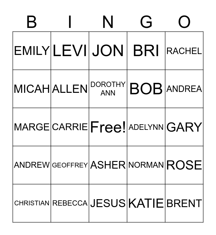 This bingo card has a free space and 24 words: GEOFFREY, REBECCA, DOROTHY ANN, CHRISTIAN, RACHEL, EMILY, MICAH, LEVI, ADELYNN, ASHER, BOB, MARGE, NORMAN, ROSE, ALLEN, KATIE, GARY, JON, ANDREA, CARRIE, BRENT, ANDREW, BRI and JESUS.