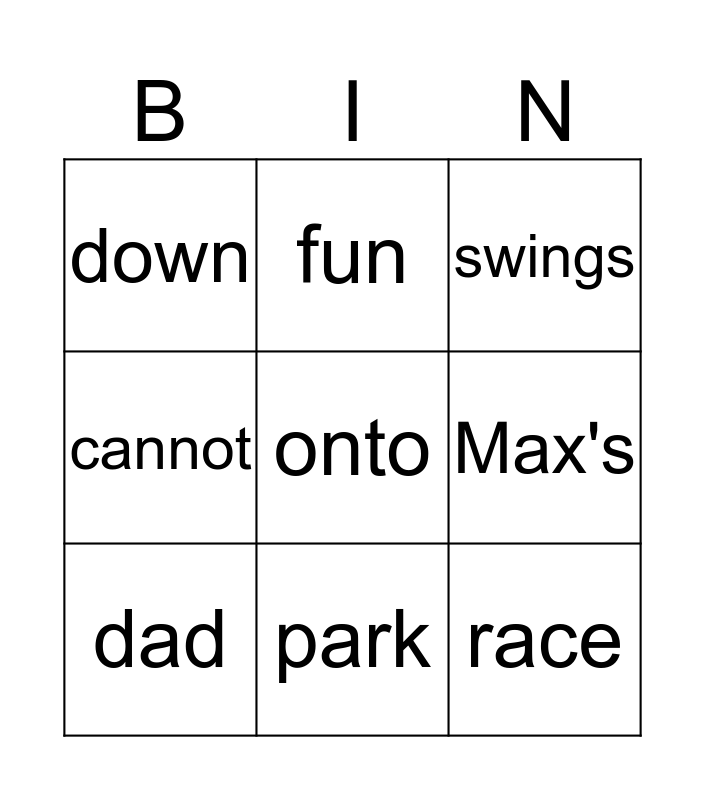 This bingo card has a free space and 8 words: Max's, swings, fun, dad, down, race, cannot and park.