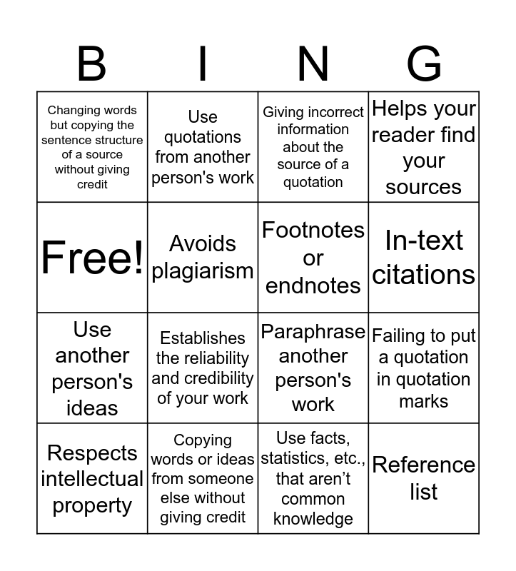 This bingo card has 16 words: Copying words or ideas from someone else without giving credit, Failing to put a quotation in quotation marks, Giving incorrect information about the source of a quotation, Changing words but copying the sentence structure of a source without giving credit, Use another person's ideas, Use quotations from another person's work, Paraphrase another person's work, Use facts, statistics, etc., that aren’t common knowledge, Free!, Avoids plagiarism, Respects intellectual property, Helps your reader find your sources, Establishes the reliability and credibility of your work, In-text citations, Footnotes or endnotes and Reference list.