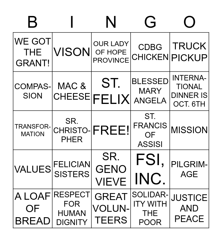 This bingo card has a free space and 24 words: FELICIAN SISTERS, RESPECT FOR HUMAN DIGNITY, ST. FELIX, A LOAF OF BREAD, TRUCK PICKUP, WE GOT THE GRANT!, COMPAS-SION, VISON, ST. FRANCIS OF ASSISI, SR. GENO VIEVE, BLESSED MARY ANGELA, TRANSFOR-MATION, FSI, INC., PILGRIM-AGE, MAC & CHEESE, SOLIDAR-ITY WITH THE POOR, MISSION, OUR LADY OF HOPE PROVINCE, INTERNA-TIONAL DINNER IS OCT. 6TH, SR. CHRISTO- PHER, JUSTICE AND PEACE, VALUES, CDBG CHICKEN and GREAT VOLUN-TEERS.