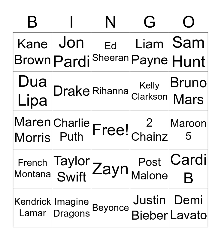 This bingo card has a free space and 24 words: Taylor Swift, Imagine Dragons, Rihanna, Kendrick Lamar, Sam Hunt, Kane Brown, Dua Lipa, Jon Pardi, 2 Chainz, Zayn, Kelly Clarkson, Maren Morris, Post Malone, Cardi B, Drake, Justin Bieber, Maroon 5, Ed Sheeran, Bruno Mars, Charlie Puth, Demi Lavato, French Montana, Liam Payne and Beyonce.