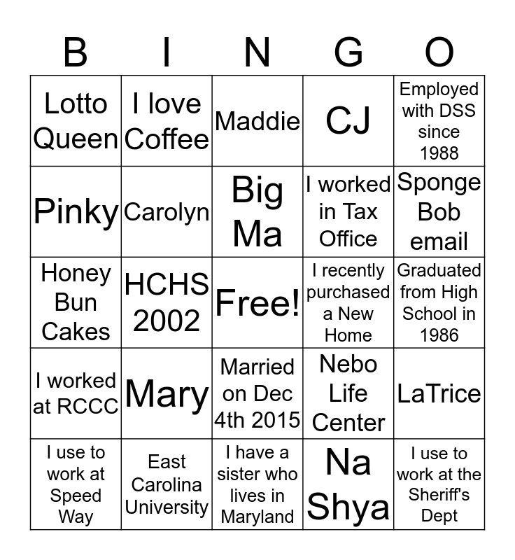 This bingo card has a free space and 24 words: Mary, East Carolina University, Big Ma, I use to work at Speed Way, Employed with DSS since 1988, Lotto Queen, Pinky, I love Coffee, I recently purchased a New Home, Married on Dec 4th 2015, I worked in Tax Office, Honey Bun Cakes, Nebo Life Center, LaTrice, Carolyn, Na Shya, Graduated from High School in 1986, Maddie, Sponge Bob email, HCHS 2002, I use to work at the Sheriff's Dept, I worked at RCCC, CJ and I have a sister who lives in Maryland.