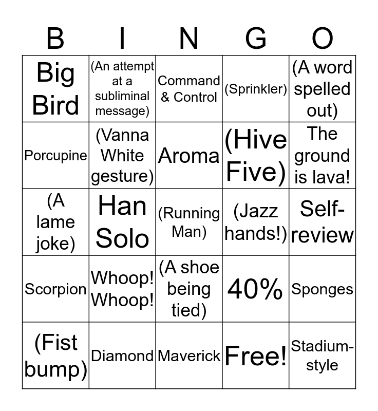 This bingo card has 32 words: Free!, Banana Bread, Han Solo, Screamy music, Scorpion, (Vanna White gesture), (A word spelled out), Sponges, (An attempt at a subliminal message), Stadium-style, Aroma, Command & Control, Flashy jewelry, Growl, (Jazz hands!), Netflix, (Fist bump), (A lame joke), (A shoe being tied), Whoop! Whoop!, 40%, Domain, Self-review, Diamond, (Running Man), (Sprinkler), (Hive Five), Porcupine, Big Bird, Maverick, Spooktacular and The ground is lava!.