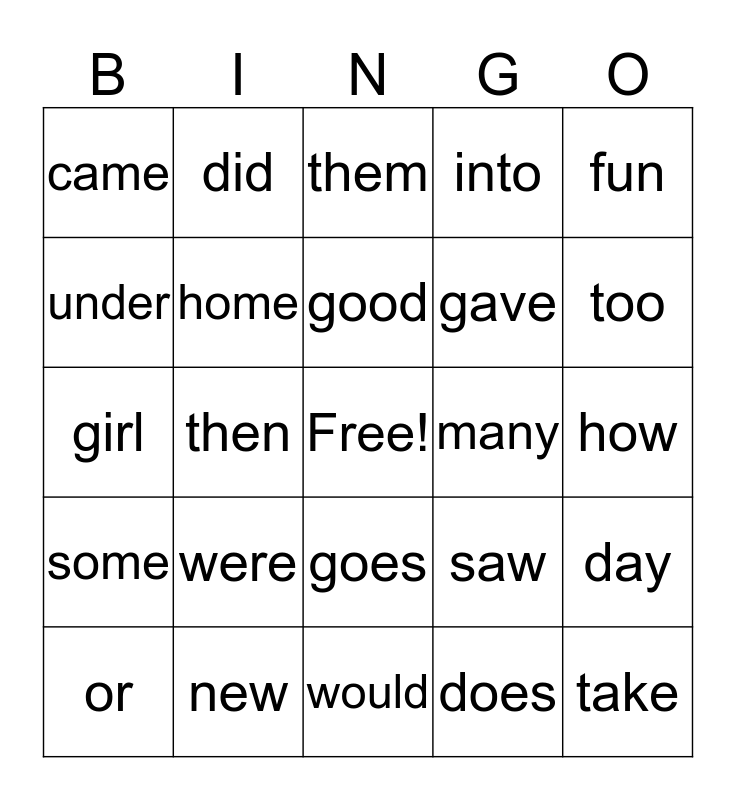 This bingo card has a free space and 24 words: were, new, good, or, fun, came, under, did, many, goes, gave, girl, saw, day, home, does, how, them, too, then, take, some, into and would.